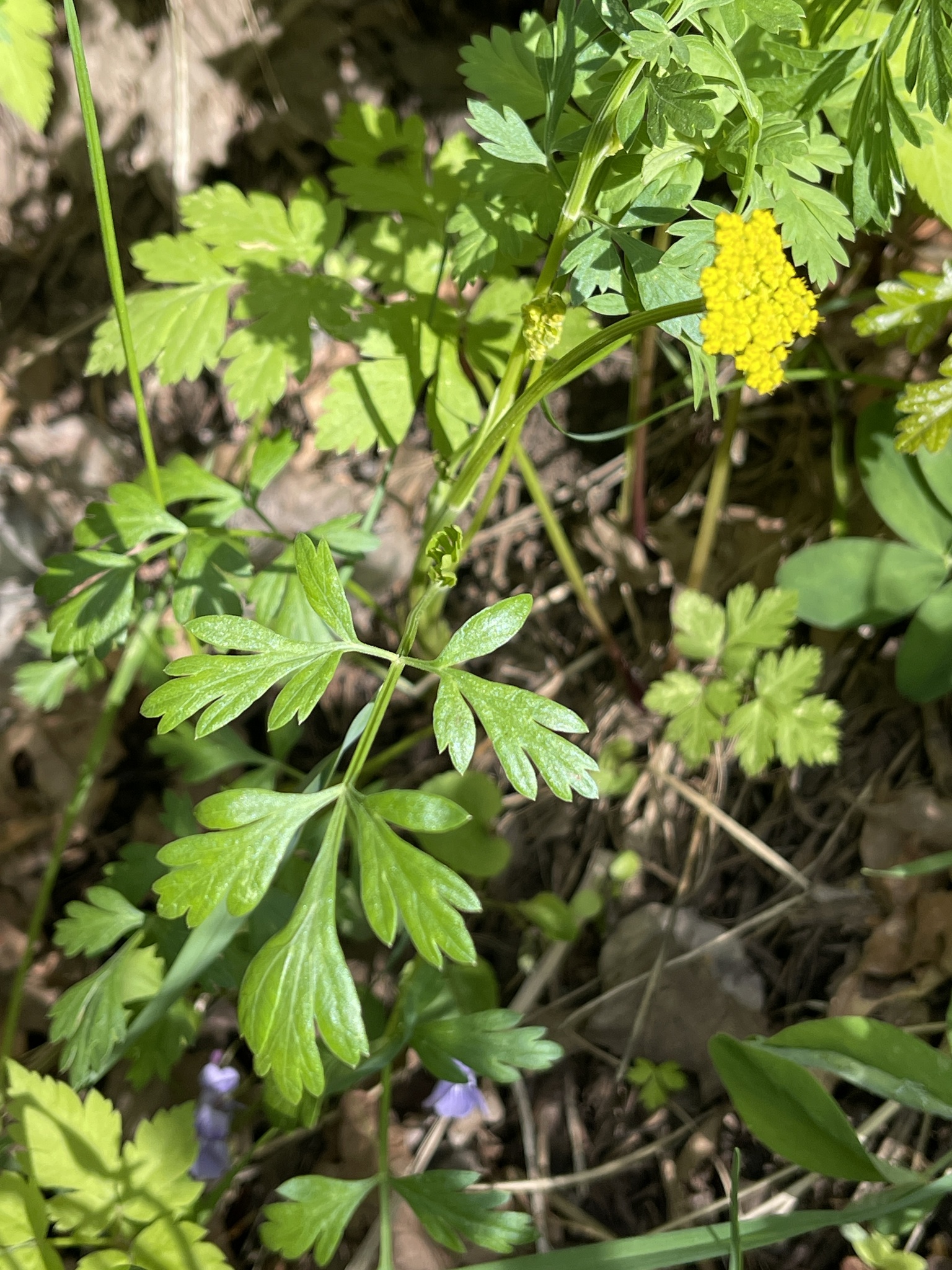 Cymopterus lemmonii, commonly known as Alpine False Springparsley or Mountain Parsley, is a native perennial herb in the parsley family (Apiaceae) found throughout the southwestern United States, including Arizona, Nevada, Utah, Colorado, Wyoming, New Mexico, and Texas, as well as northern Mexico. The plant grows at elevations from 5,500 to 12,000 feet, typically in pine woods and grasslands at higher elevations. It produces bright yellow flowers in flat-topped umbels from May to October, though flower color can vary from yellow to orange-purple to purple. Cymopterus lemmonii, (Pseudocymopterus montanus), Alpine False Springparsley, Southwest Desert Flora
